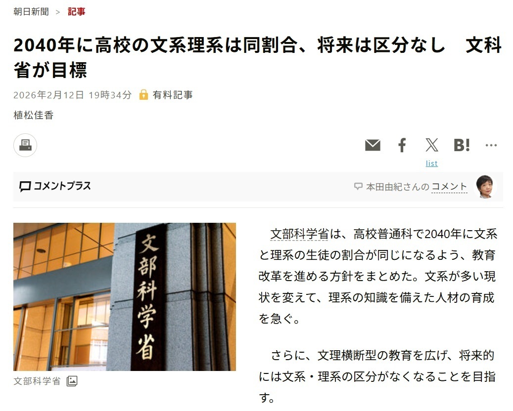 2040年、つまり今から15年後に高校の普通科で文系・理系の割合を半々にするという計画です。